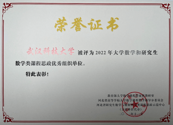 万博max体育官网入口被评为2022年大学数学和研究生数学类课程思政优秀组织单位,万博官网教师蒋君被评为大学数学和研究生类课程思政教学名师;龚谊承获得大学数学和研究生数学类课程思政教学优秀案例特等奖,蒋君、李春丽、张青、张学英获得一等奖,咸艳霞获得二等奖。